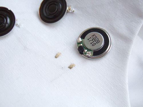 The speakers will be covered with crochet, but we wanted to make them detachable in case something breaks or needs to be resoldered, etc.  First we embroidered our circuit with conductive thread, stitching pads on the dress where the speakers will be connected.  We’ve soldered crimp beads to the speakers so that we can sew them (with conductive thread) to the embroidered pads on the dress.