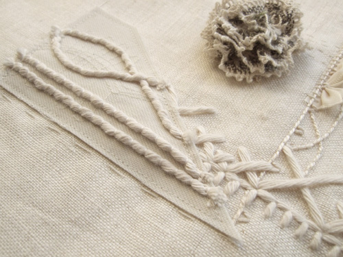 I then cut the fabric out to follow the lines of the previous layer and attached it with decorative yarn applique.