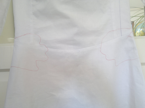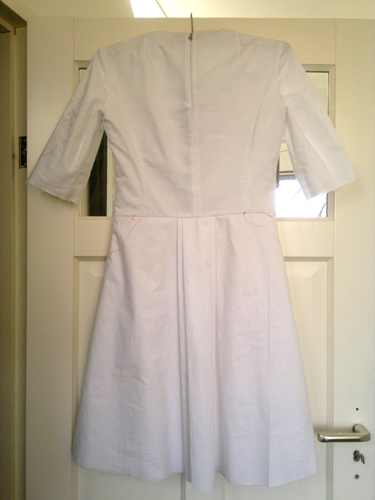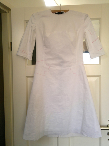 We plan to make three dresses with three different themes. The themes are taken from poems we’ve found on antique embroidery samplers and each poem says something about the person who made the embroidery and communicates a certain feeling, e.g., weariness, melancholy, resolve. We’ve translated each theme into a gesture which, when made by the wearer, will trigger audio of the poem being read. We’ll write more about the poems later, but meanwhile, here are some photos of the toile we’ve made for the dresses.