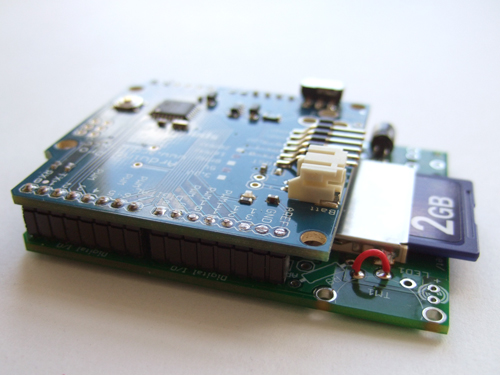 Lots of progress withe the Wave Shield! Thanks to the tip posted in the adafruit forums, we managed to reduce our Wave Shield/Arduino Pro sandwich to 1.5cm in total, including all the sticky-out components. Behold: